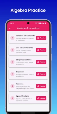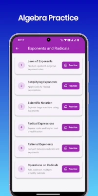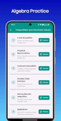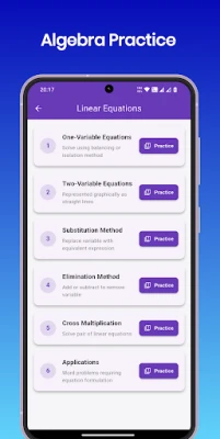 The Algebra Practice app simplifies complex math concepts into easy to understand lessons. From expressions and equations to functions and graphs, every topic is presented with clarity and practical examples. Students can test their understanding with quizzes and progress toward complete algebra mastery.