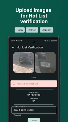 - Hot List Verification via Image Upload: Snap. Upload. Confirm. Eliminate guesswork by simply taking a photo of a vehicle to determine its relevance to ongoing investigations.